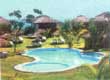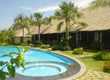 Set in expansive gardens, the traditional circular bungalows shelter under the shade of coconut palms. The oval swimming pool is particularly inviting.